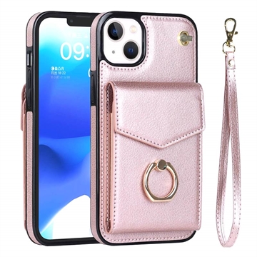 For iPhone 14 Plus Accordion Style RFID Blocking Card Holder Protective Cover PU Leather+TPU Ring Kickstand Anti-scratch Case with Strap