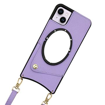 For iPhone 14 Plus Fish Tail Design PU Leather Coated TPU Phone Case Mirror Function Card Holder Cover with Shoulder Strap