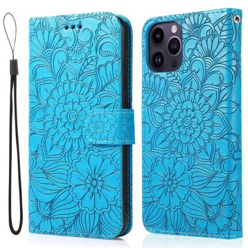 PU Leather Phone Case for iPhone 14 Pro Max, Imprinted Flower Pattern Stand Wallet Case with Strap