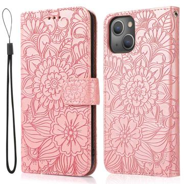 For iPhone 14 Imprinted Flower Pattern PU Leather Phone Cover Stand Shockproof Phone Wallet Case with Strap