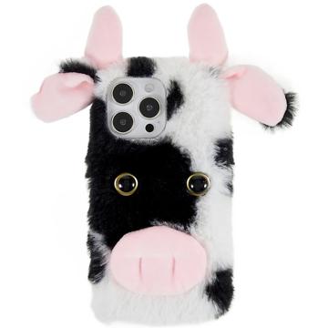 For iPhone 14 Pro Cute Milk Cow Ear Winter Furry Soft TPU Case Winter Phone Protective Shell