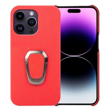 For iPhone 14 Pro Max Genuine Leather + Hard PC Protective Shell Litchi Texture Ring Kickstand Anti-Drop Phone Cover