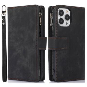 For iPhone 14 Pro Max Zipper Pocket Card Holder Phone Protective Case Skin-touch PU Leather Stand Wallet Cover with Wrist and Shoulder Strap