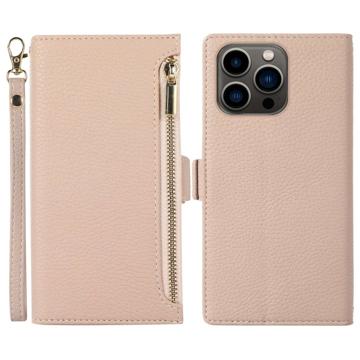 iPhone 14 Pro Wallet Case with Strap & Zipper - Apricot