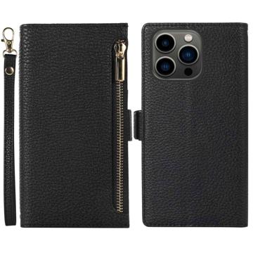 Litchi Texture Phone Case for iPhone 14 Pro, Zipper Pocket Full Coverage PU Leather Phone Flip Cover Wallet with Strap
