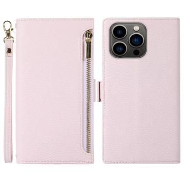 Litchi Texture Phone Case for iPhone 14 Pro, Zipper Pocket Full Coverage PU Leather Phone Flip Cover Wallet with Strap