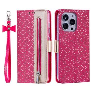 Lace Pattern Wallet Case for iPhone 14 Pro Max This incredibly stylish wallet case with lace pattern protects your iPhone 14 Pro Max from damage, and front zipper pocket lets you store paper money and coins.