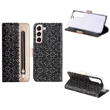 Lace Pattern Wallet Case for Samsung Galaxy S22 5G Keep all your essentials safe in one place with this unique Lace Pattern Wallet Case for Samsung Galaxy S22 5G. Secured with a zipper and magnetic closure, your Samsung Galaxy S22 5G and your money, ID, credit cards are perfectly protected. You can also enjoy watching videos hands-free thanks to the stand mode.